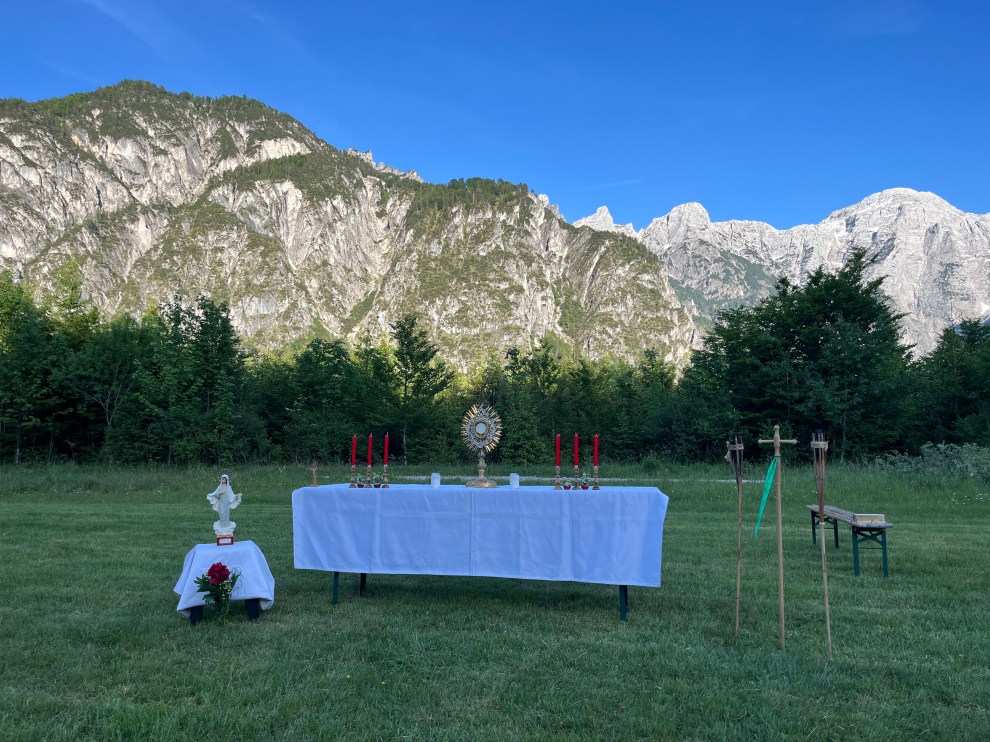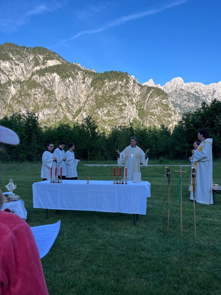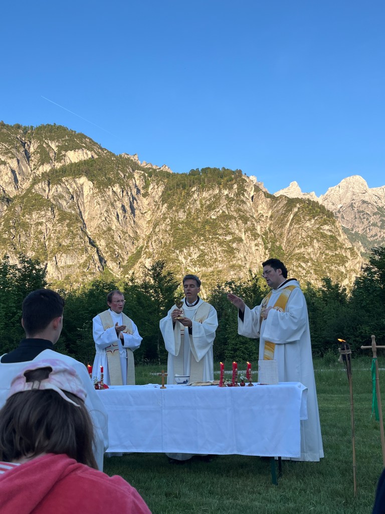 Um 16:30 durften wir dann die Gäste zum regulären Juni-Treffpunkt begrüßen: Eröffnet wurde der Treffpunkt Benedikt mit einem leckeren Eis-Talk. Im anschließenden Vortrag nahm uns P. Anselm mit hinein in das 10-jährige Jubiläum der Enzyklika „Laudato si“ von Papst Franziskus, die besonders die Mensch-Schöpfungs Beziehung und ihre Krisen anspricht. Nach Aussetzung und Beichtgelegenheit feierten wir eine festliche Heilige Messe mit Abt Bernhard, begleitet von einer Predigt von P. Franz. Den Abend ließen wir gemeinsam am Lagerfeuer beim Knackergrillen und Liedern bis spät in die Nacht ausklingen.
