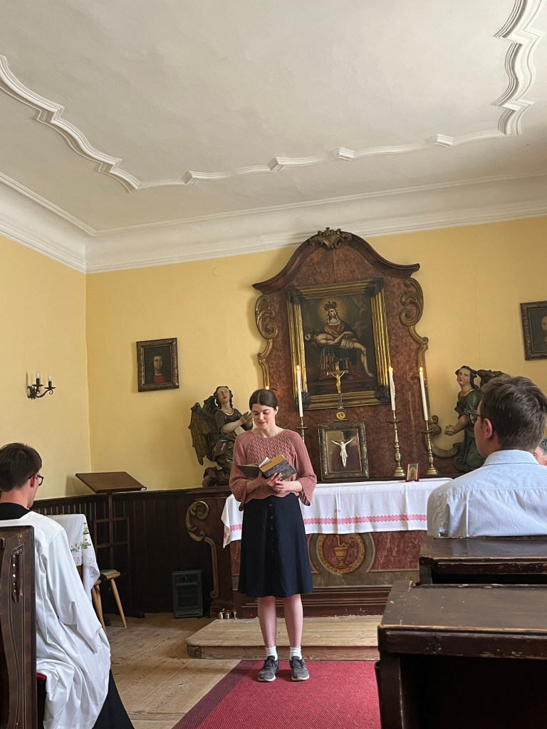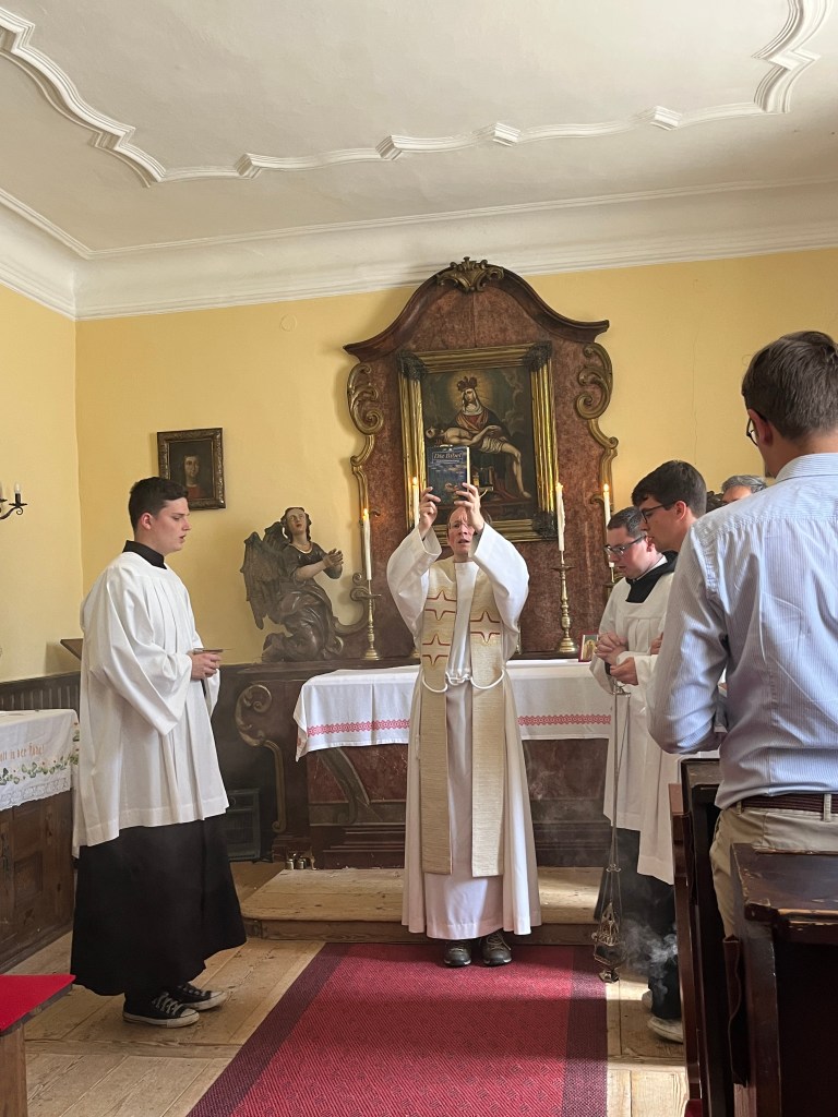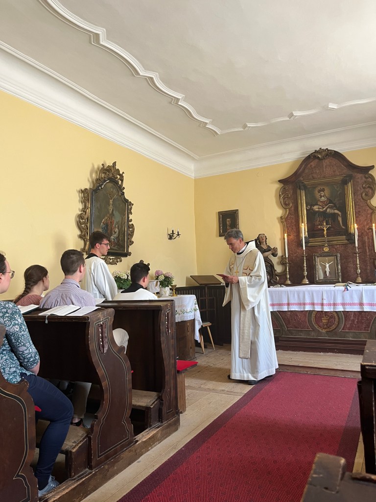 Der Sonntag begann mit der Laudes am See und einer Betrachtung der Pfingstsequenz. Symbolisch nahm jeder einen Stein für seine Lasten und eine Blume für seine Freuden mit in die anschließende Sonntagsmesse mit Abt Bernhard in der Almseekapelle. So ging ein erfülltes Wochenende am Almsee zu Ende, das uns wieder neues Vertrauen darauf gegeben hat, dass Christus unser fester Grund ist und unser Leben wie die Natur um den Almsee zum Blühen bringt.