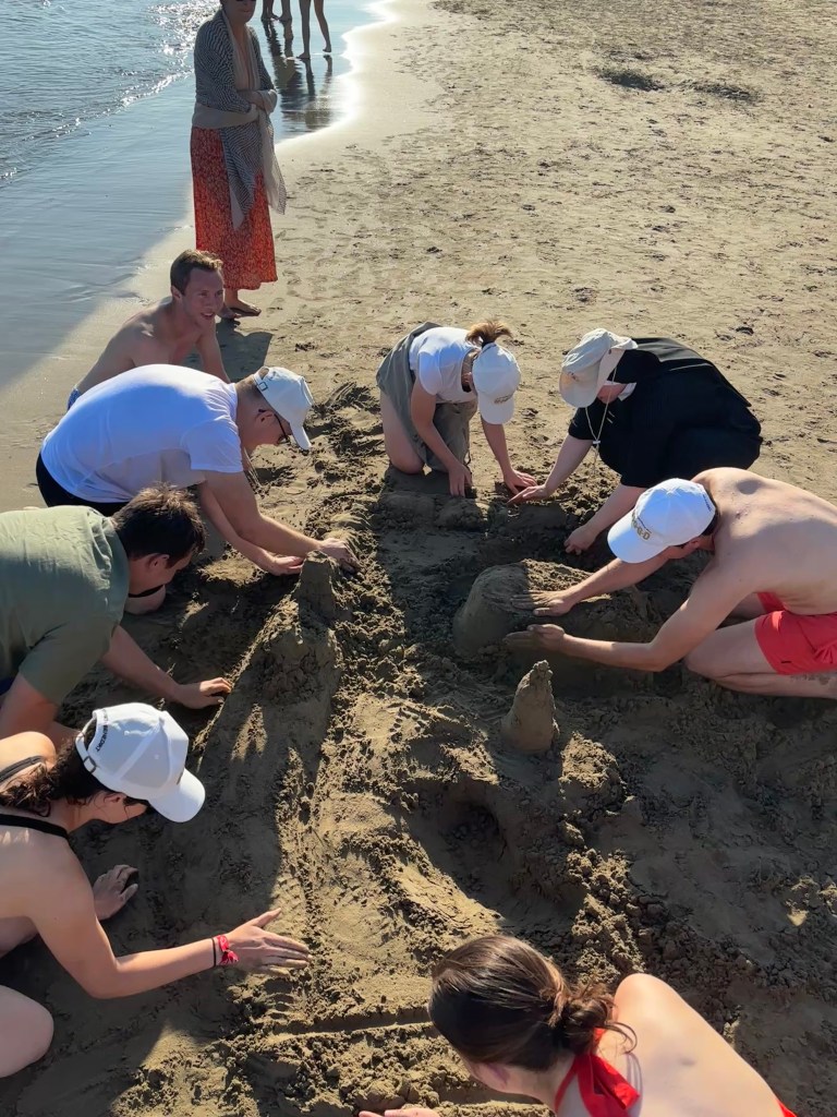 Unsere Gruppe wurde zu einem köstlichen italienischen Mittagessen in einem Schwesternkonvent eingeladen, von deren Terrasse aus in der Ferne das Meer zu erahnen war. Dorthin ging es am Nachmittag. In Nettuno besuchten wir das Heiligtum der hl. Maria Goretti, die dort begraben ist, und gingen im Meer baden. Am Strand erbauten einige ein Stift aus Sand.