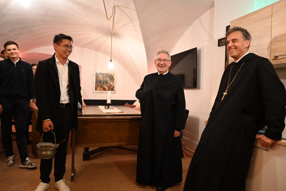 Obwohl die Zeit schon fortgeschritten war, kamen danach noch sehr viele Leute mit in das neu umgebaute „Bennoleum“. Dabei handelt es sich um einen Raum im Gasttrakt des Stiftes, der von Treffpunkt Benedikt für kleiner Veranstaltungen und Treffen, v.a. für den TB-Sunday genutzt wird. Über den Sommer haben einige motivierte Handwerker aus den Treffpunkt Benedikt Team Großes geleistet und den Raum komplett renoviert. Abt Bernhard zeigte sich bei der Segnung stark beeindruckt von der Initiative und gespannt auf zukünftige Projekte, die in diesem Raum einen Ort finden werden.