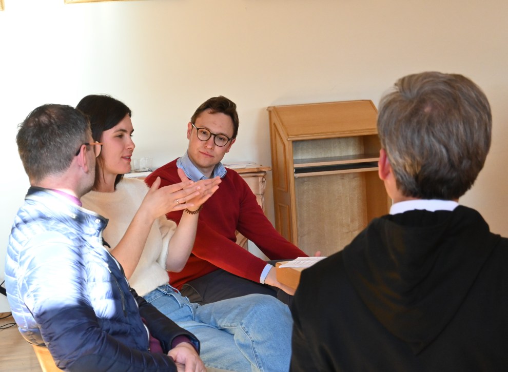 Noch ganz erfüllt von der Osterfreude startete der Treffpunkt Benedikt wie gewohnt um 16:30 Uhr mit dem Tea-Talk im Grünen Salon. Bei Kaffee, Kuchen und regem Austausch über die vergangenen Osterfeiertage wurde die Vorfreude auf das Thema spürbar. In der anschließenden Talkrunde im Wintersaal gaben Andrea und Michael Gruber sehr persönliche Einblicke in ihren Alltag und schilderten, wie sich das geistliche Leben und die Suche nach Gott gerade in den Herausforderungen und Freuden des Familienlebens abspielen. Abt Bernhard ergänzte diese Erfahrungen aus seiner Perspektive und betonte, dass die Gottsuche im Kloster und in der Familie oft viel ähnlicher ist, als allgemein angenommen wird. Er unterstrich, dass es sich letztlich um zwei verschiedene Ausprägungen derselben Sehnsucht handelt und wie sehr diese Berufungen einander inspirieren und befruchten können.