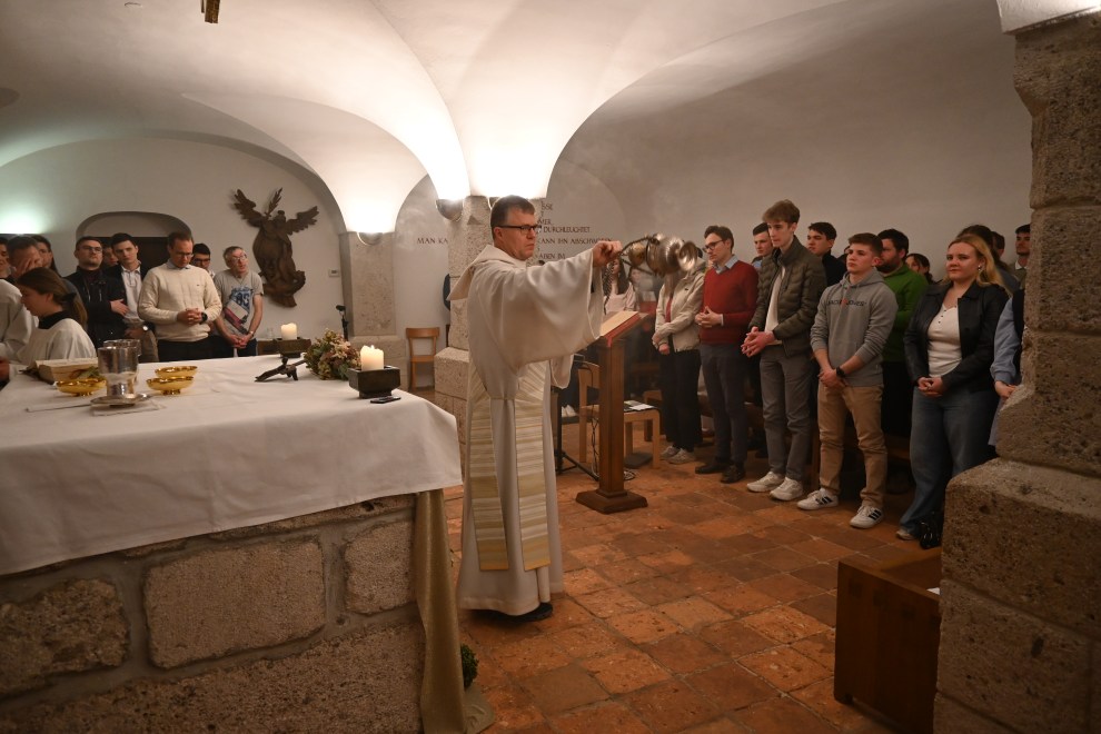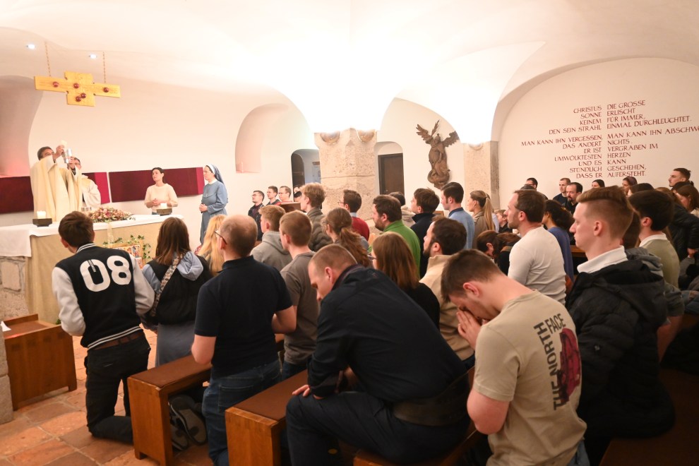 Im Anschluss führte uns der Weg in die Michaelskapelle zur eucharistischen Anbetung und Beichtgelegenheit. In der Stille vor dem Herrn konnten die Impulse des Nachmittags nachwirken. Den Höhepunkt bildete die Heilige Messe, zelebriert von Abt Bernhard.