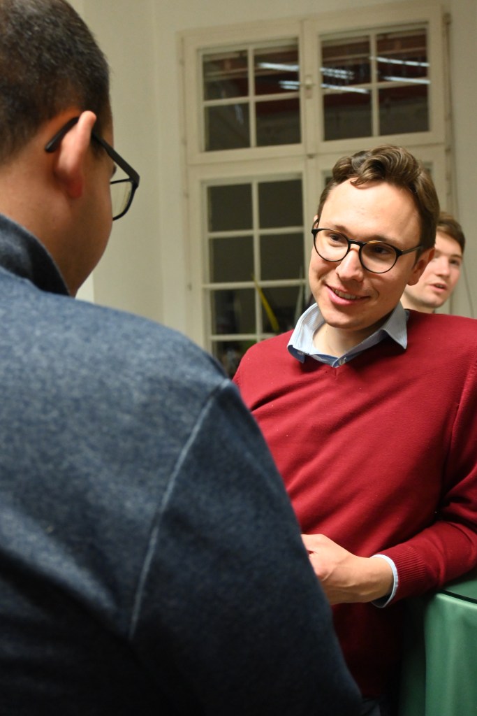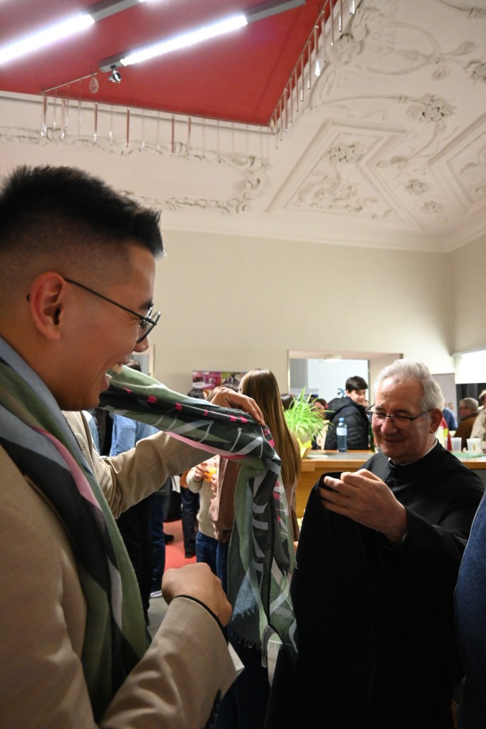 Nach der Heiligen Messe war der Abend noch lange nicht zu Ende. Zunächst lud die Agape im Kaisersaalfoyer dazu ein, bei Weckerl und Getränken die Gemeinschaft zu genießen. Doch eine besondere österliche Überraschung wartete noch auf uns. Da die Osterzeit noch in voller Blüte steht, begab sich die gesamte Gruppe zum Guntherdenkmal. Das Suchen und Finden der dort versteckten Schokoeier im stimmungsvollen Kerzenschein zeigte schnell, dass die kindliche Freude am Suchen und Entdecken vor keinem Alter haltgemacht hat. Was uns wiederum die perfekte Steilvorlage lieferte, um auch jenen am Vorabend seines Geburtstags hochleben zu lassen, der beim Treffpunkt Benedikt ohnehin ewig jung bleibt. Ganz im Sinne von „Werdet wie die Kinder“ nahmen wir diese österliche Freude mit nach Hause und freuen uns schon jetzt auf den nächsten Treffpunkt Benedikt am 2. Mai.